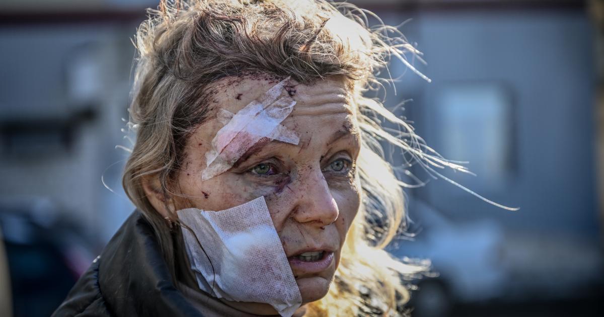 „Žena zraněná během leteckého útoku na obytný komplex ve městě Čuhujiv, Charkovská oblast, Ukrajina, 24. února 2022,” stojí v popisku. Jako autor je uveden Wolfgang Schwan.