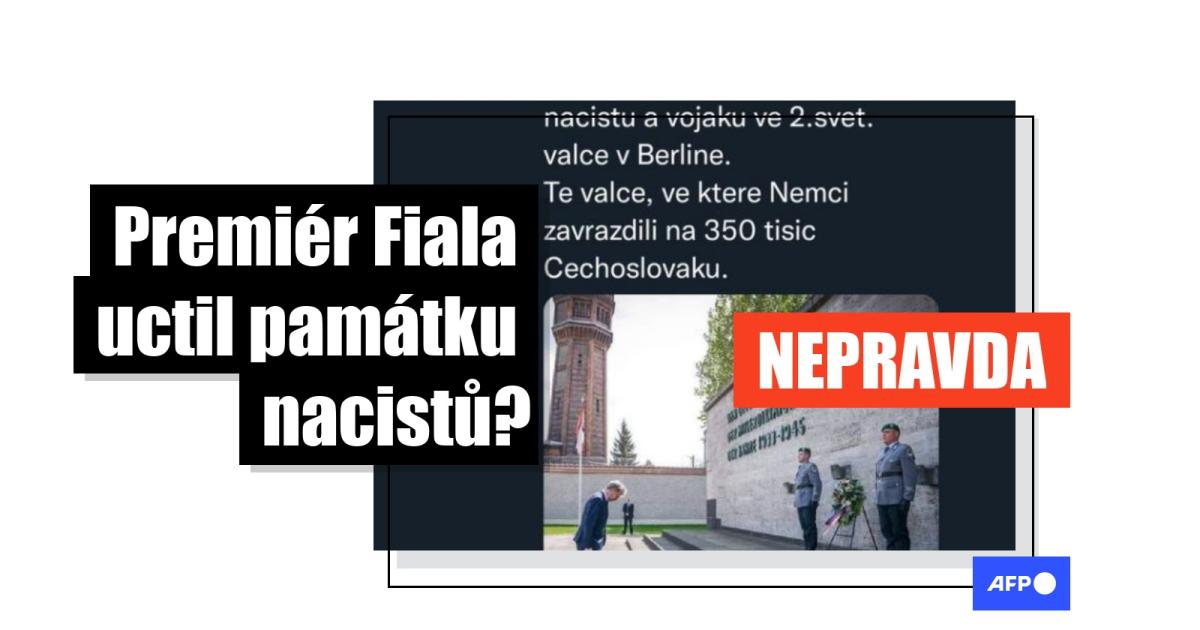 „Premiér ČR se šel poklonit památce padlých německých nacistů a vojáků ve 2. světové válce v Berlíně. Té válce, ve které Němci zavraždili na 350 tisíc Čechoslováků,” tvrdí příspěvek z 6. května 2022, který na Facebooku sdílelo přes 1 100 uživatelů. Stejný text koloval také na Twitteru, ale místo fotografie Fialy k němu byly připojeny snímky českých obětí nacismu.