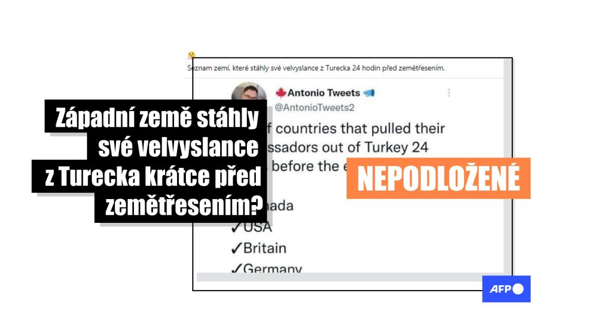 „Seznam zemí, které 24 hodin před zemětřesením stáhly své velvyslance z Turecka. Asi jsou jasnovidci,“ stojí například v tomto příspěvku z 16. února 2023. Příspěvek obsahuje screenshot tweetu v angličtině, podle kterého západní země jako Kanada, Spojené státy, Velká Británie, Německo, Belgie, Itálie, Nizozemsko a Francie stáhly své velvyslance z Turecka těsně před zemětřesením o síle 7,8 stupně Richterovy škály, jež 6. února zasáhlo jihovýchod Turecka a sousední Sýrii a zabilo více než 50 000 lidí. Toto a podobná tvrzení sdílely na Facebooku stovky českých uživatelů.
