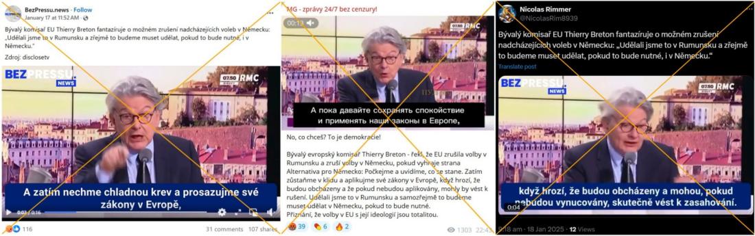 „Bývalý komisař EU Thierry Breton fantazíruje o možném zrušení nadcházejících voleb v Německu,“ tvrdí shodně tyto příspěvky, načež citují Bretona, jenž v úryvku říká: „Udělali jsme to v Rumunsku a zřejmě to budeme muset udělat, pokud to bude nutné, i v Německu.“
