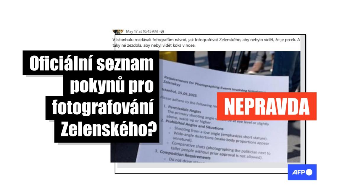 „Tisková kancelář Zelenského v Istanbulu rozdávala pokyny novinářům, jak správně fotografovat kyjevského diktátora,“ tvrdí tento příspěvěk, který se na Facebooku objevil 16. května 2025. O den později údajný „návod“ zveřejnil také tento příspěvek s tím, že měl sloužit k tomu, „aby nebylo vidět, že je prcek“. Falešný seznam se šířil i na síti Telegram.