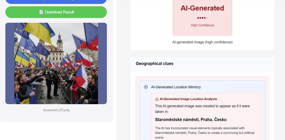 Podle dalšího nástroje na rozpoznání umělé inteligence Image Whisperer záběr velmi pravděpodobně vznikl s pomocí AI. Podle tohoto nástroje výjev na snímku napodobuje pražské Staroměstské náměstí.