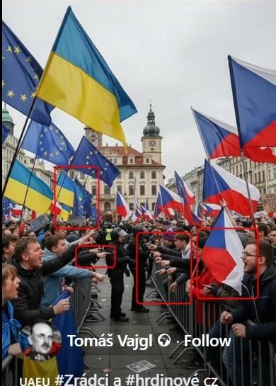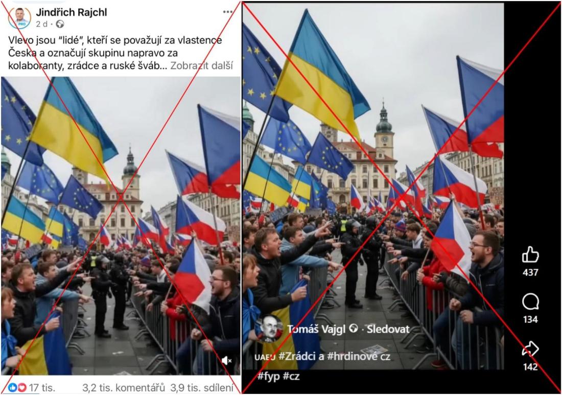 Virální snímek konfrontace mezi demonstranty s ukrajinskými a českými vlajkami je dílem AI