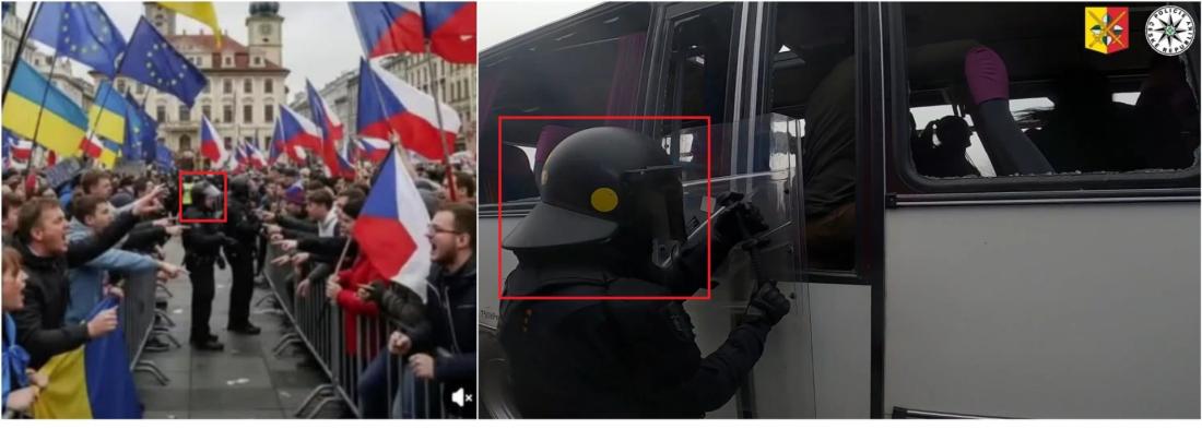 Ze srovnání provedeného agenturou AFP vyplynulo, že na přilbách na virálním snímku chybí barevně výrazné značení po stranách a zadní ochranný štít. Obojí je vidět na helmách, které má ve výbavě pražská pořádková policie.