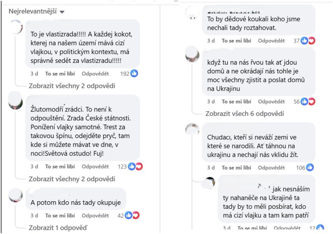 „To je vlastizrada!!!!! A každej [nadávka], kterej na našem území mává cizí vlajkou v politickým kontextu, má správně sedět za vlastizradu!!!!!,“ zní jeden takový komentář. V jiném se píše: „Žlutomodří zrádci. To není k odpouštění. Zrada České státnosti. Ponížení vlajky samotné.“