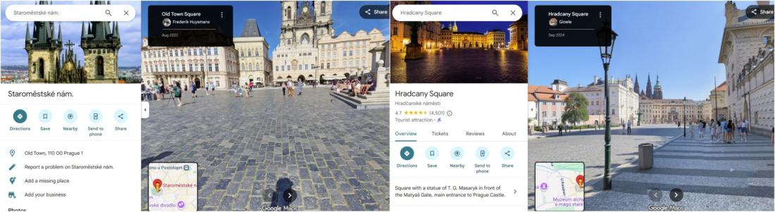 Vyhledávání ve Street View na Google Maps potvrdilo, že ani na jednom z těchto míst se nevyskytují domy z virálního snímku. Vyhledávání v Google Maps také ukázalo, že narozdíl od moderní dlažby na virálním obrázku jsou obě náměstí vydlážděná kostkami.