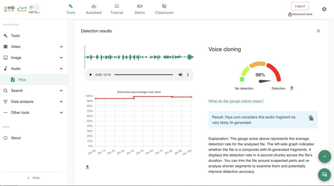 Mimo to i detektory AI dospěly k závěru, že video není autentické. AFP analyzovala jeho zvukovou stopu pomocí aplikace Hiya na rozpoznání syntetických hlasů v ověřovacím nástroji agentury AFP InVID-WeVerify. Výsledek odhalil, že mužův výbušný výlev vygenerovala s 98% jistotou umělá inteligence.