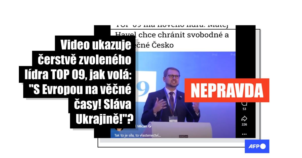 „Tak to je síla, to vlastenectví...“ píše se ve facebookovém příspěvku, který obsahuje šestivteřinové video, v němž nově zvolený předseda TOP 09 křičí za řečnickým pultem: „S Evropou na věčné časy! Sláva Ukrajině!“ Nad videem je patrný text, který působí jako novinový titulek: „TOP 09 má nového lídra. Matěj Havel chce chránit svobodné a bezpečné Česko“. Příspěvek z 8. listopadu 2025 získal přes 280 sdílení.