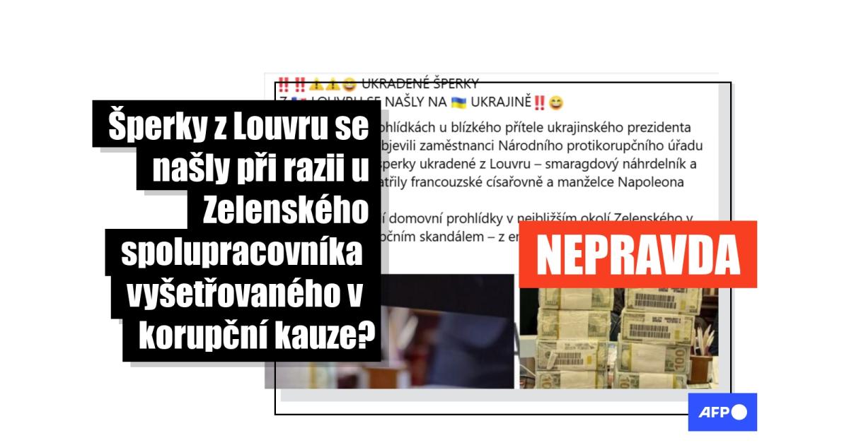 Podle nepravdivých příspěvků ukrajinští vyšetřovatelé našli šperky z Louvru během razie v domě uprchlého podnikatele Timura Mindiče, bývalého obchodního partnera ukrajinského prezidenta Volodymyra Zelenského. Mindič, 46, je jedním z hlavních podezřelých v rozsáhlé korupční kauze v energetickém sektoru.