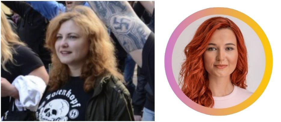 Příspěvky doprovází fotografie pochodu, v jejímž popředí je čtveřice včetně mladé ženy se zrzavými vlasy. Na sobě mají černá trička s lebkou a nápisem v němčině Totenkopf - Meine Ehre heisst Treue (Smrtihlav - Věrnost je mou ctí pozn. red.), což byl symbol a motto příslušníků nacistických jednotek Waffen SS.