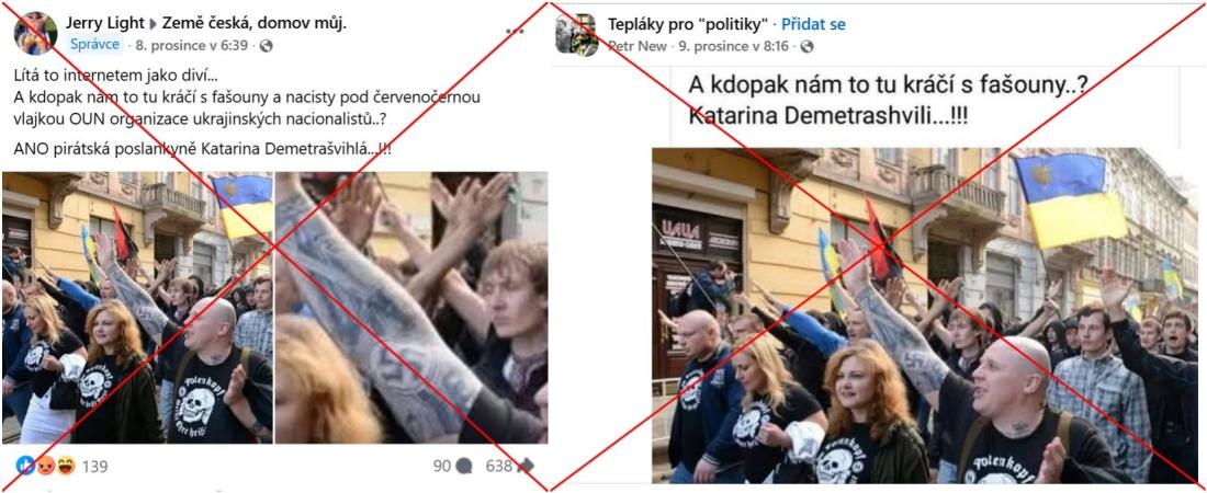 „A kdopak nám to tu kráčí s fašouny a nacisty pod červenočernou vlajkou OUN organizace ukrajinských nacionalistů..? ANO pirátská poslankyně Katarina [sic] Demetrašvihlá...!!!“ píše se ve facebookovém příspěvku z 8. prosince 2025, který má přes 630 sdílení.