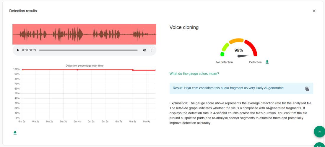 Aplikace Hiya z nástroje InVID-WeVerify dospěla k závěru, že zvuk je dílem AI s 99% jistotou.