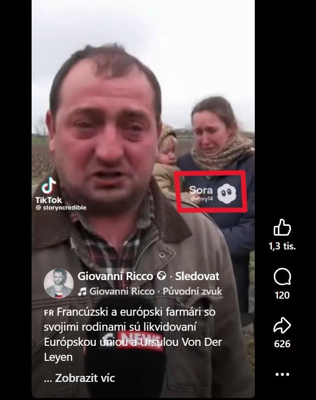 Video údajné farmářské rodiny navíc obsahuje logo Sora, které ukazuje, že ho vygenerovala aplikace firmy OpenAI. Logo ve tvaru obláčku se pohybovalo také v dalších videích s údajnými francouzskými sedláky na stejném tiktokovém účtu.
