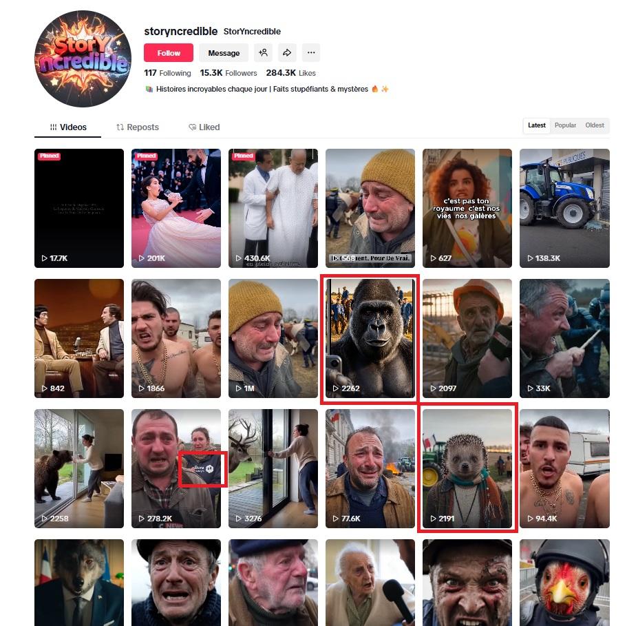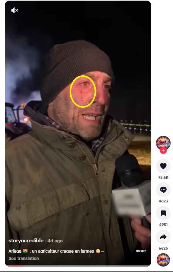 Obě videa obsahují tiktokové uživatelské jméno „@storyncredible“. Vyhledávání na TikToku nás navedlo na účet, který video údajného sedláka s krvavými slzami nahrál 13. prosince 2025 s následujícím textem ve francouzštině: „Ariège: farmář pláče. Farmář v Ariège. Na pokraji zhroucení mluví otevřeně na kameru. Úzkost, osamělost, vyčerpání. Zemědělský svět trpí – poslechněte si jeho svědectví.“