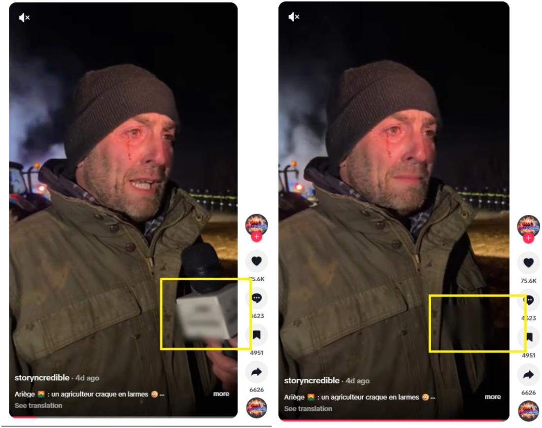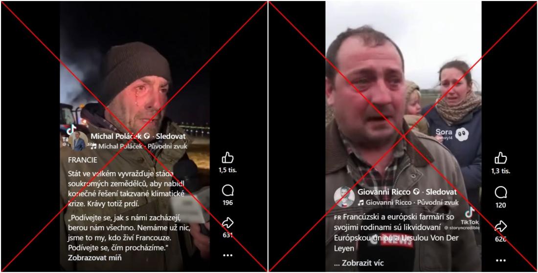 Klip údajné farmářské rodiny se na stejném tiktokovém účtu objevil o dva dny později s francouzským textem: „Pláčou nad svým povoláním – rodina zemědělců rozvrácená zákonem. Se slzami v očích podává rodina zemědělců svědectví. Nespravedlivé zákony je připravují o příjem a ohrožují jejich budoucnost. Poslechněte si jejich srdcervoucí nářek.“