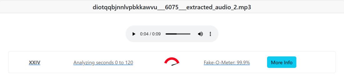 AFP analyzovala zvukovou stopu videa pomocí dvou nástrojů na rozpoznání syntetických hlasů. Podle detektoru Deepfake Total od Fraunhoferova institutu pro aplikovanou a integrovanou bezpečnost AISEC hlas vygenerovala umělá inteligence s 99,9% pravděpodobností.