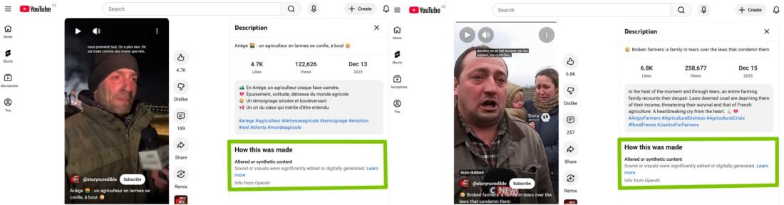 Totožný účet zveřejnil desítky podobných videí naříkajících nebo rozzuřených francouzských sedláků, ale minimálně od 18. prosince 2025 na něm nejsou k dispozici. Dohledat se ovšem dají na sesterském kanále na YouTube. Popis obou videí na YouTube, která sdíleli čeští uživatelé Facebooku, obsahuje poznámku americké technologické společnosti OpenAI, že „zvuk nebo obraz byl výrazně upraven nebo digitálně vygenerován“.