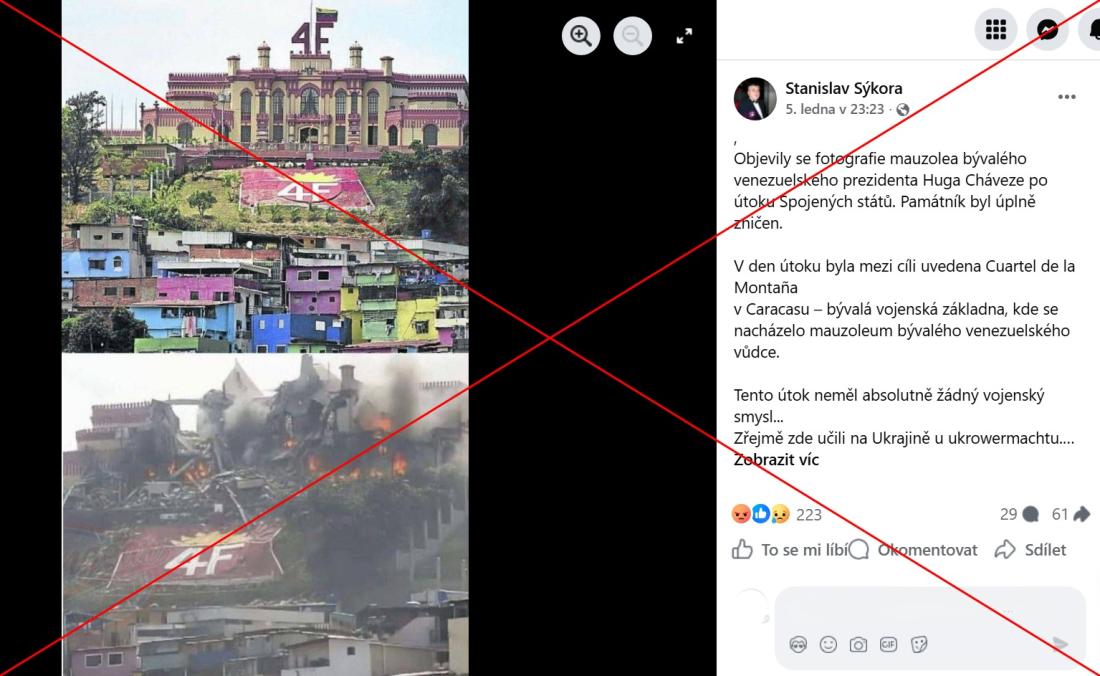 Na sítích rovněž kolovalo tvrzení, že Američané vybombardovali mauzoleum zesnulého venezuelského prezidenta Huga Cháveze v budově historických kasáren Cuartel de la Montaña. Některé příspěvky se opíraly o obrázek zničené hořící budovy zahalené kouřem, který podle zjištění AFP vytvořila umělá inteligence.