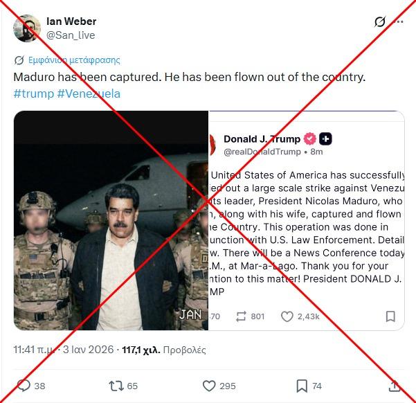 Několik hodin po intervenci zveřejnil prezident Trump na sociální síti Truth Social snímek, na kterém je svržený venezuelský lídr na palubě lodi USS Iwo Jima. Agentura AFP nedokázala zjistit původní zdroj této fotografie, jejíž pravost nepotvrdily ani americké nebo venezuelské úřady, ani renomovaná média.