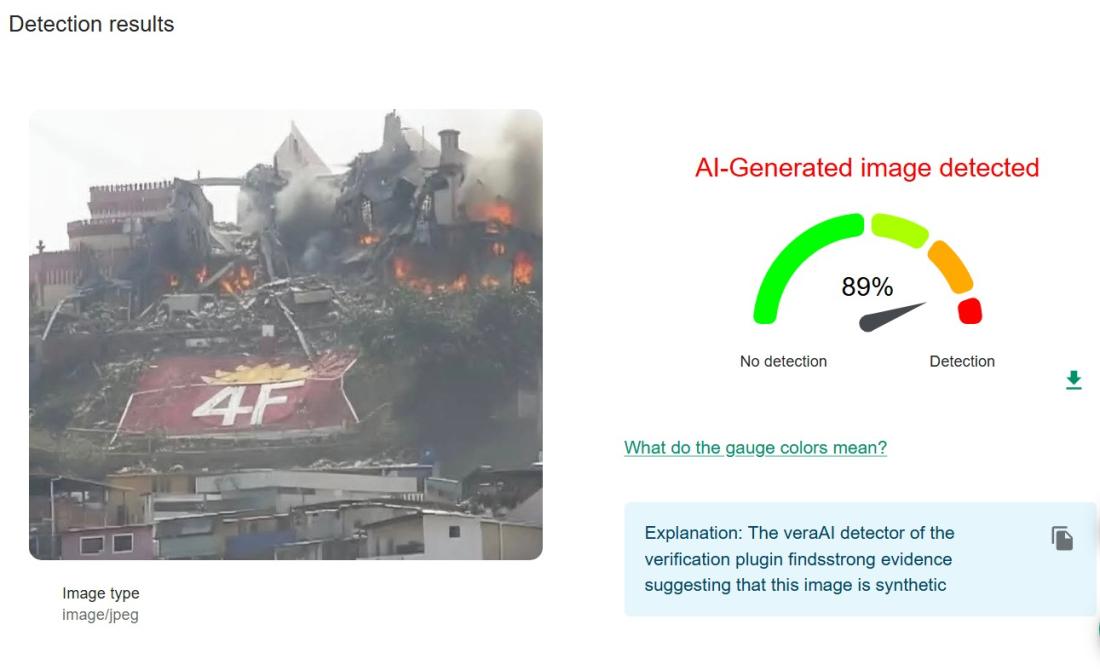 Analýza obrázku hořících kasáren v nástroji InVID-WeVerify navíc ukázala, že ho umělá inteligence vygenerovala s 89% pravděpodobností.
