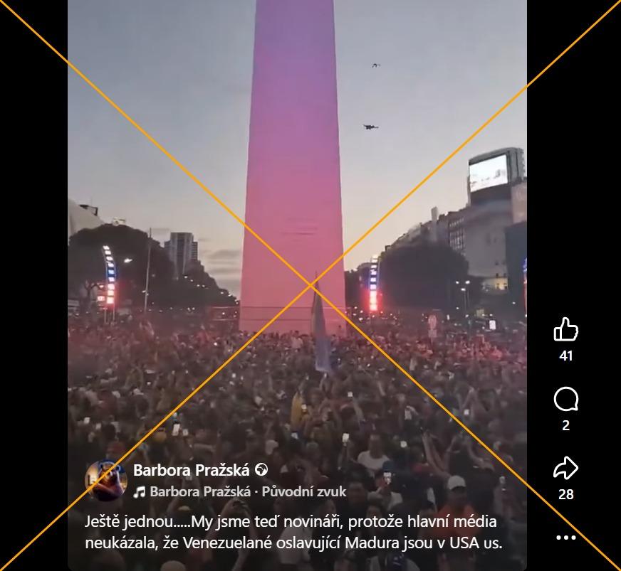 Záběr zobrazuje dav, který mává venezuelskou vlajkou a obklopuje Obelisk na náměstí Plaza de la República v Buenos Aires. Spodní část známé památky je nasvícená červenorůžově, což se shoduje s nasvícením pilíře v barvách venezuelské vlajky z 3. ledna 2026, kdy pod ním Venezuelané slavili Madurovo zatčení. Jak uvedla redakce AFP v Agentině, potvrzuje to srovnání se záběry oslav argentinského zpravodajského webu Clarin.com.