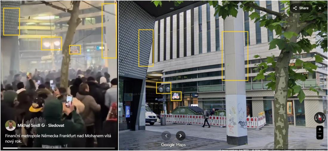 Agentura AFP se obrátila s žádostí o komentář na frankfurtskou policii. „Váše pátrání je správné: video zachycuje události na [ulici] Zeil o silvestrovské noci 2023/2024,“ uvedl mluvčí frankfurtského policejního prezidia Patrick Rüter v e-mailu z 8. ledna 2026.
