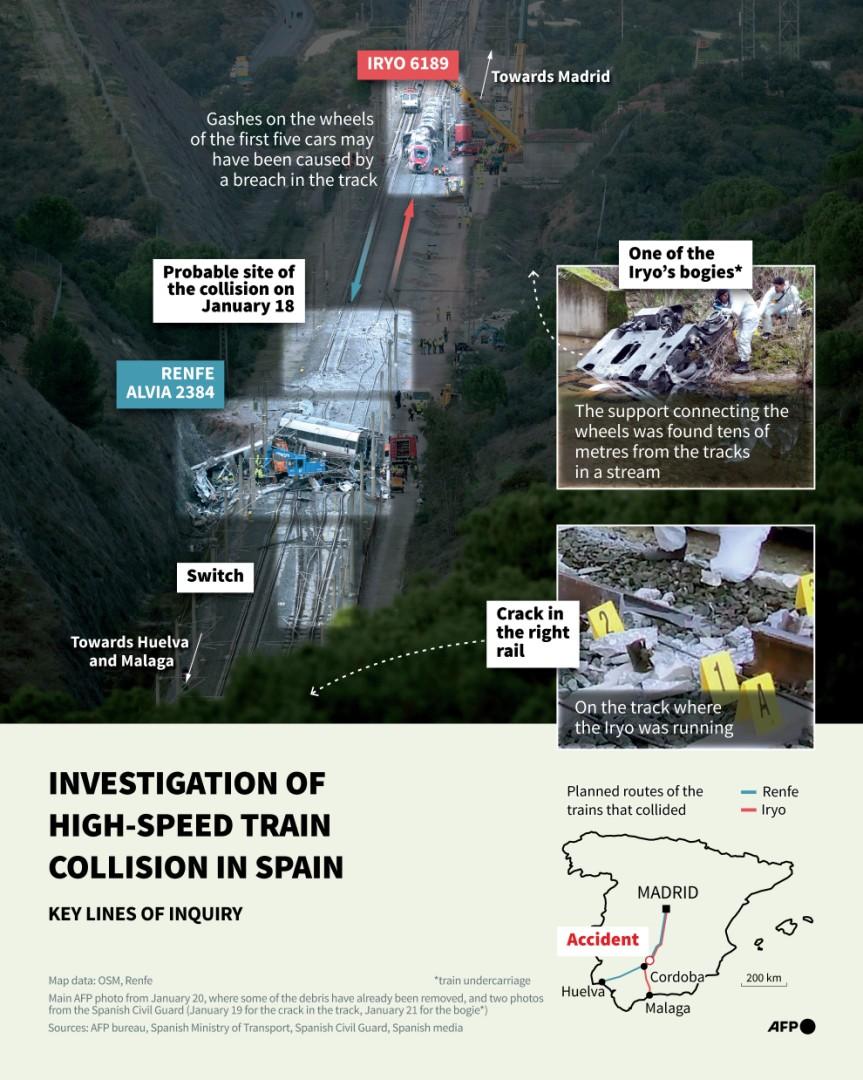 Vyšetřování na místě nehody měla na starosti španělská policejní složka Guardia Civil (Civilní garda pozn. red.). Její zástupce sdělil AFP 10. února 2026, že „v žádném okamžiku nemáme žádné záznamy o tom, že by byla zvažována hypotéza teroristického útoku“.