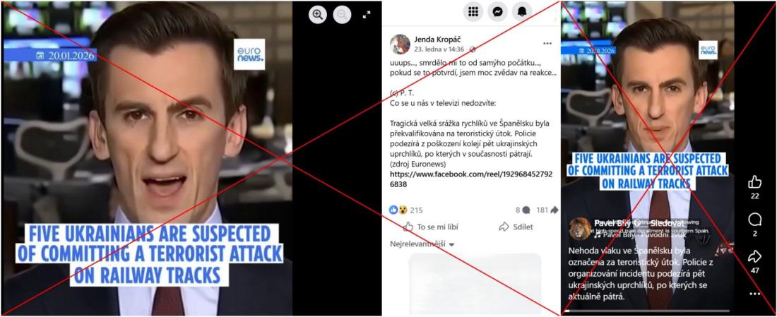 Tragická srážka rychlovlaků na jihu Španělska si v polovině ledna 2026 vyžádala 46 životů. Na sociálních sítích se v následujících dnech šířilo video, které mělo vypadat jako vysílání zpravodajské stanice Euronews. Obsahovalo tvrzení, že španělští policisté nehodu vyšetřují jako teroristický útok a z jeho spáchání podezírají pět ukrajinských uprchlíků. AFP ale zjistila, že zvuková stopa obsahuje část vygenerovanou umělou inteligencí. Příčina tragédie se přitom stále vyšetřuje.