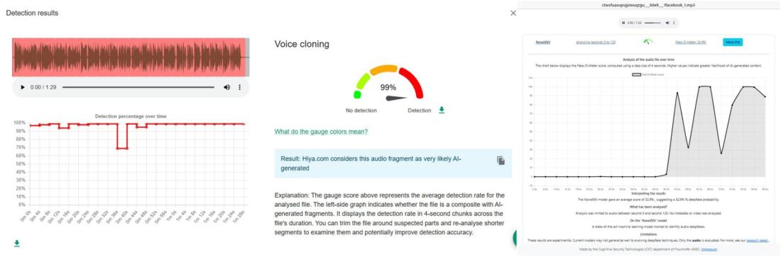 Nástroj Deepfake Total od Fraunhoferova institutu pro aplikovanou a integrovanou bezpečnost AISEC dospěl ke zdánlivě neprůkaznému výsledku. Podle něj audio vyrobila umělá inteligence s 32,9% jistotou.