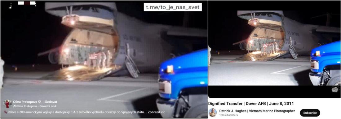 AFP kontaktovala Hughese, který potvrdil, že záběry natočil na letecké základně Dover Air Force Base v americkém Delawaru. „Jsem původním autorem videa a záběry jsem nahrál na internet,“ uvedl a poskytl AFP další záběry, které tehdy pořídil.