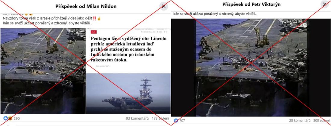 „Největší válečná loď světa ABRAHAM LINCOLN byla kolem 15:30 zasažena čtyřmi balistickými raketami íránskou stranou,“ píše se ve facebookovém příspěvku z 3. března 2026, který nasbíral 300 sdílení. „Všechny kanály, jak domácí, tak zahraniční, o tom informovaly jako o první zprávě. USA okamžitě zasáhly a nařídily cenzuru zpráv. Toto je jen jeden příklad, ale věřte mi, že podobných zpráv je mnoho.“