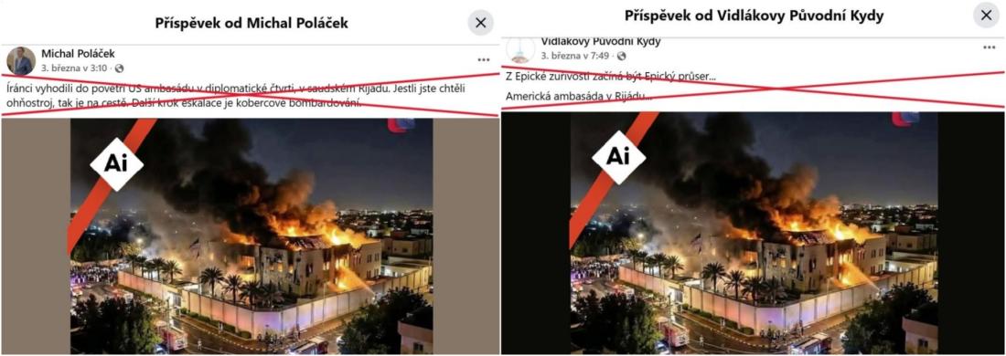 „Íránci vyhodili do povětří US ambasádu v diplomatické čtvrti, v saudském Rijádu. Jestli jste chtěli ohňostroj, tak je na cestě,“ píše se ve facebookovém příspěvku z 3. března 2026. Společně s podobným postem ze stejného dne měly přes 130 sdílení. Obrázek také koloval v angličtině, portugalštině nebo řečtině.