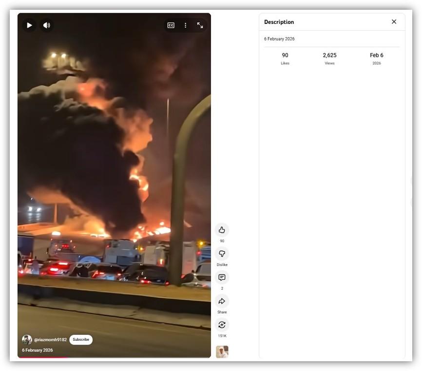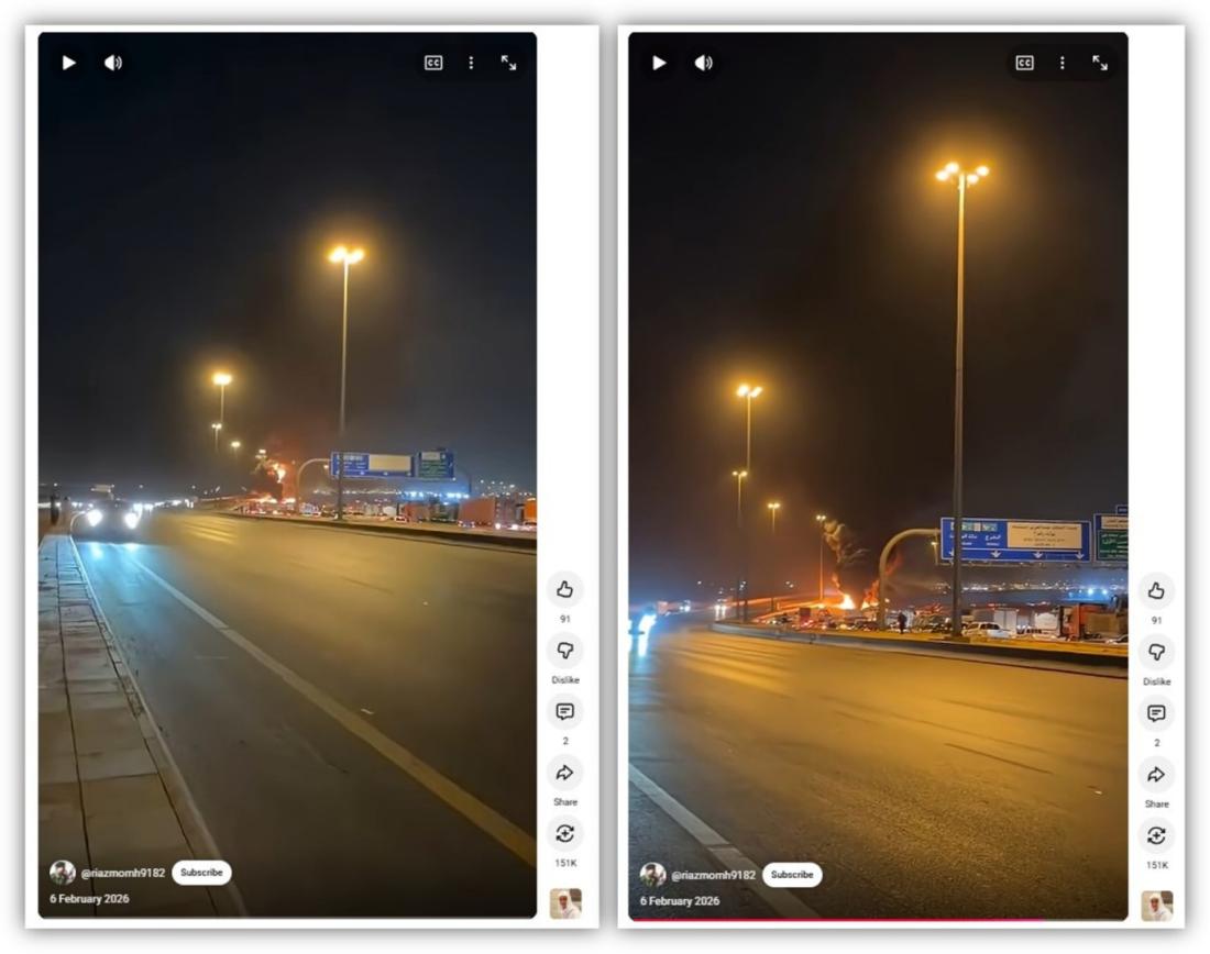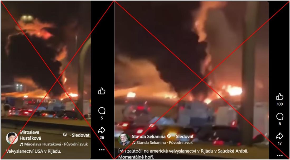 V souvislosti s dronovým útokem na americkou ambasádu v Saúdské Arábii kolovalo na sociálních sítích také video velkého požáru u víceproudové silnice. V češtině se objevilo 3. března 2026 na Facebooku a Telegramu. Záběr z videa použil ve svém článku také jeden z webů, který byl označen Nadačním fondem nezávislé žurnalistiky jako konspirační.