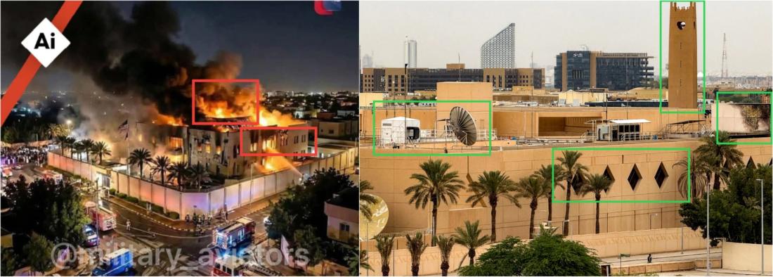 Od vypuknutí války na Blízkém východě na konci února 2026 zaplavily sociální sítě záběry útoků válčících stran. Některé z nich ale zachycují jiné události nebo vznikly s pomocí umělé inteligence. Ve spojení s odvetným íránským útokem na velvyslanectví Spojených států v saúdském Rijádu se na sociálních sítích šířilo jak nesouvisející video požáru na silničním obchvatu, tak obrázek vygenerovaný AI. Útok íránských dronů způsobil na ambasádě menší požár. Nepravdivé příspěvky ale jeho rozsah zveličovaly. AFP vyvrátila pravost sdílených záběrů.