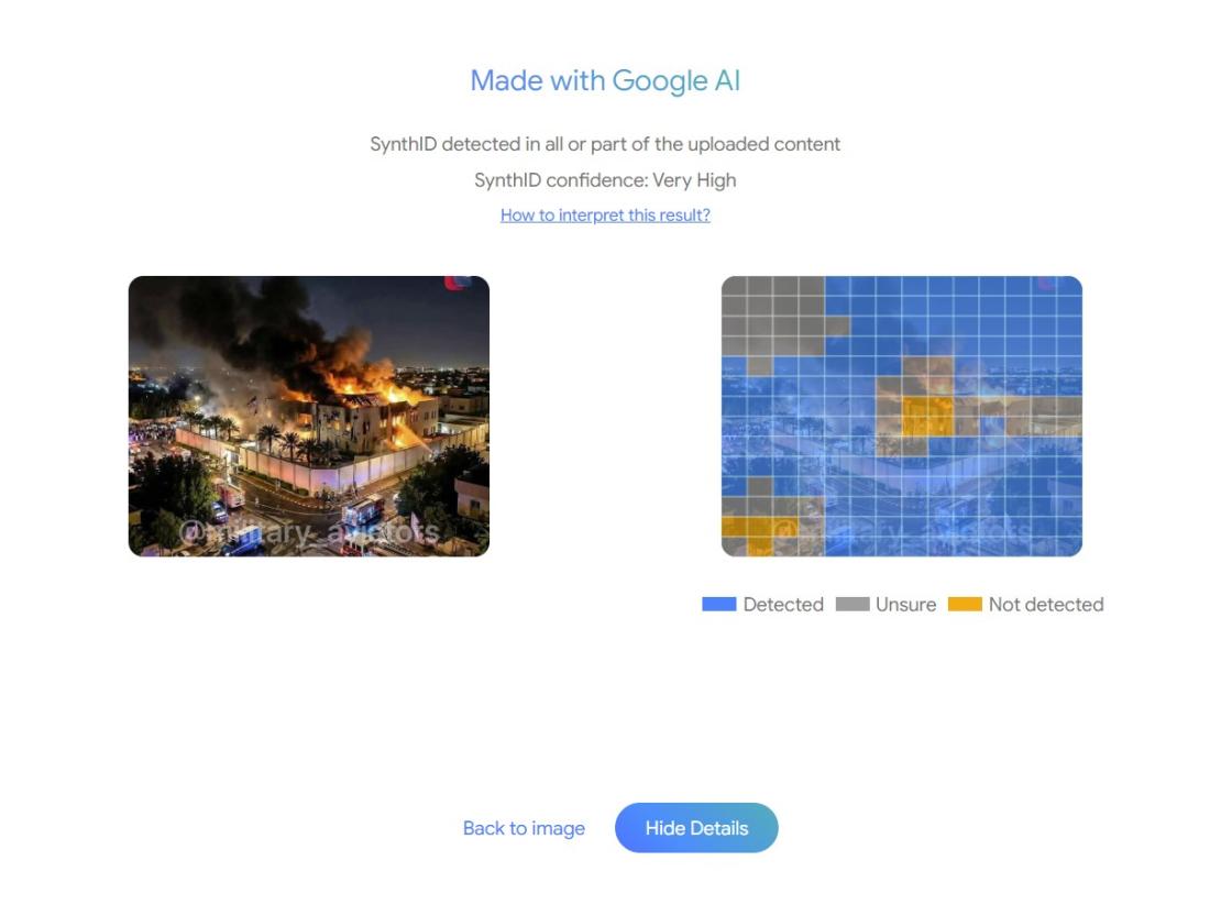 Obrázek jsme také analyzovali pomocí nástrojů na rozpoznání umělé inteligence. Analýza odhalila, že obsahuje digitální vodoznak SynthID, který dokazuje, že ho vygeneroval jeden z modelů společnosti Google. Podle nástroje SynthID, který stejnojmenný vodoznak umí detekovat, obrázek vygenerovala Google AI s „velmi vysokou“ jistotou.