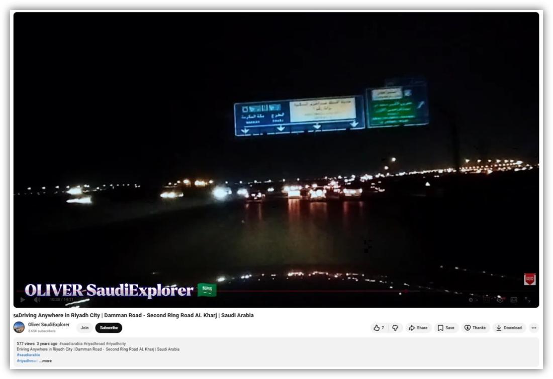 AFP zhlédla záběry z palubních kamer automobilů, které řidiči v Rijádu nahráli na YouTube. Srovnali jsme dopravní značení ve virálním klipu se značením na videu, které zachycuje jízdu na druhém městském okruhu v saudské metropoli (archiv). Značení, šipky, barvy i text vypadají shodně.