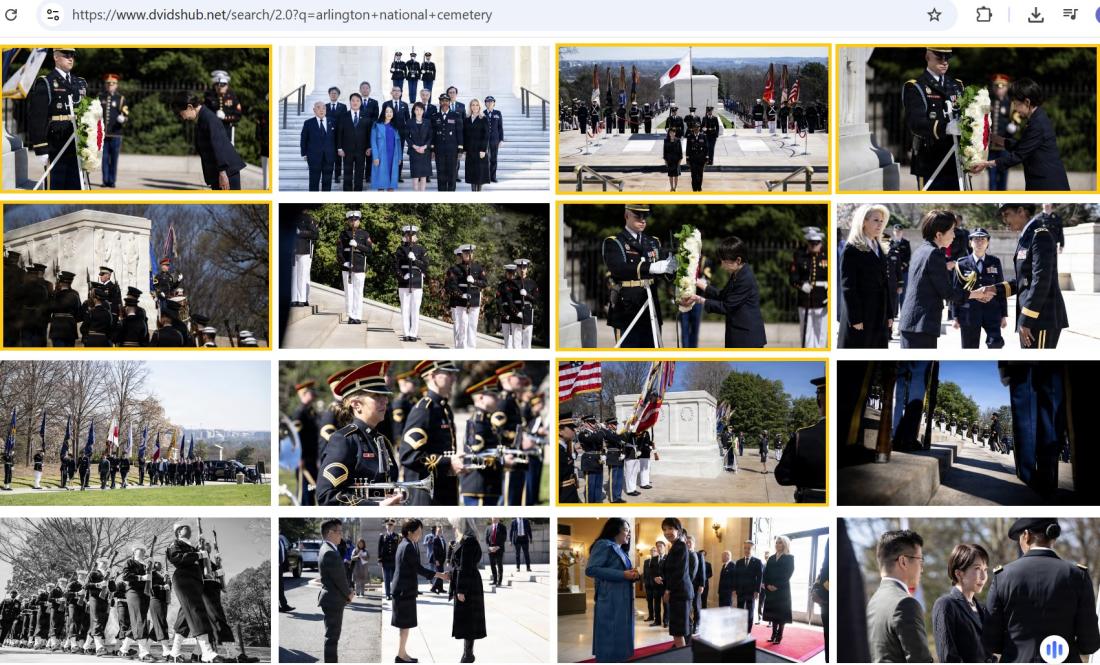Premiérčinu návštěvu nejvýznamnějšího amerického vojenského hřbitova potvrzují také oficiální fotografie dostupné na webu americké služby Defense Visual Information Distribution Service (DVIDS) užívané k distribuci armádních fotografií, videí a zvukových záznamů (archiv).