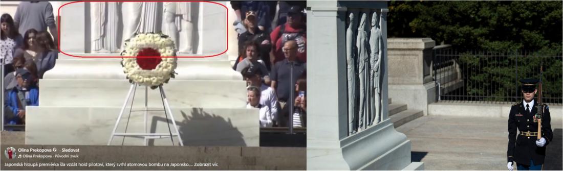 Srovnání posledního záběru z virálního videa s fotografiemi hrobu neznámého vojína, které pořídila AFP, zase potvrzuje, že video z nepravdivých příspěvků skutečně zobrazuje návštěvu japonské premiérky u tohoto památníku na arlingtonském hřbitově. Reliéf na památníku je ve videu i na fotce totožný.