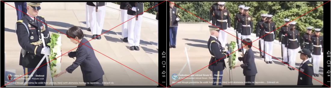 Na prvním záběru kráčí japonská premiérka Sanae Takaiči v doprovodu ženy v americké vojenské uniformě, amerických vojáků a pravděpodobně členů diplomatické delegace. Na druhém pokládá věnec u památníku, který vidíme v třetím a posledním záběru.