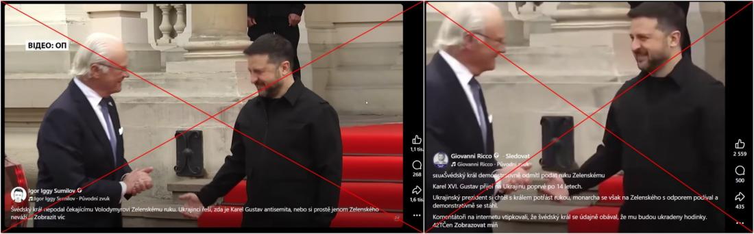 Oblíbeným a často se opakujícím tématem na proruských účtech na sociálních sítích je tvrzení, že ukrajinského prezidenta Volodymyra Zelenského ignorují významní politici a hlavy států. V této souvislosti koluje na internetu video, které údajně zachycuje švédského krále Karla XVI. Gustava, jak Zelenskému odmítá podat ruku během návštěvy ukrajinského Lvova v dubnu 2026. Video je ale zmanipulované. Fotografie a záběry agentury AFP z místa události ukazují, že si státníci rukou potřásli.