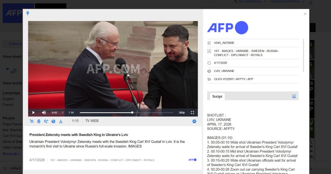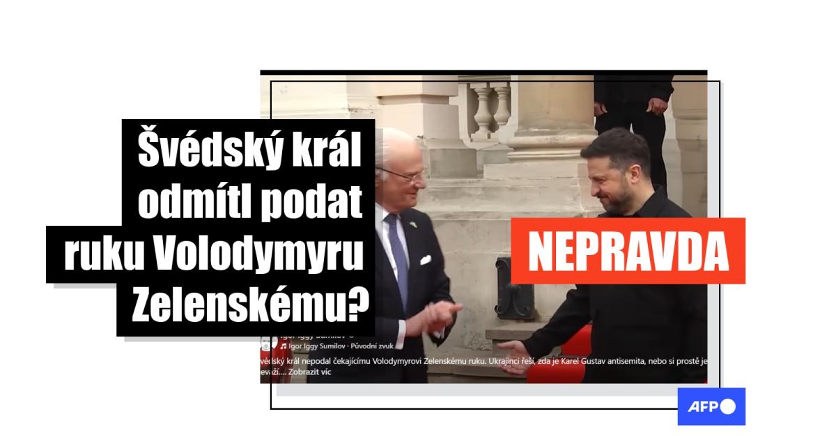 Švédský královský dvůr popřel 18. dubna 2026 v prohlášení pro švédskou veřejnoprávní televizi SVT nepravdivé tvrzení, že švédský král nepozdravil Zelenského podáním ruky. Článek zmiňuje jako možný zdroj virálního videa příspěvek na platformě X ruské státní televize Russia Today (RT). Agentura AFP video dohledala, přičemž je k dispozici zde. Všimli jsme si také, že na videích sdílených na sociálních sítích je částečně vidět logo RT.