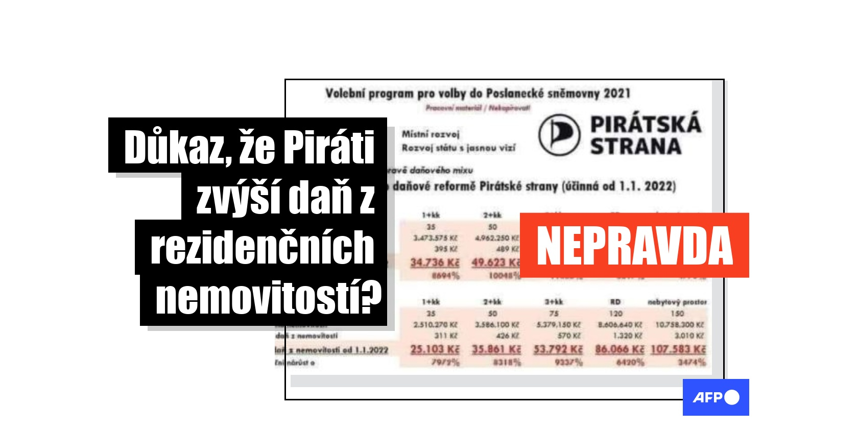 Dokument opatřený logem Pirátské strany s názvem „Volební program pro volby do Poslanecké sněmovny 2021” obsahuje příklady daně z nemovitosti pro pět velkých českých měst včetně Prahy a Brna v případě, že by se daň navýšila na jedno procento ze současných setin procenta. Od 22. dubna 2021 jej sdílely stovky uživatelů Facebooku například zde, zde či zde.